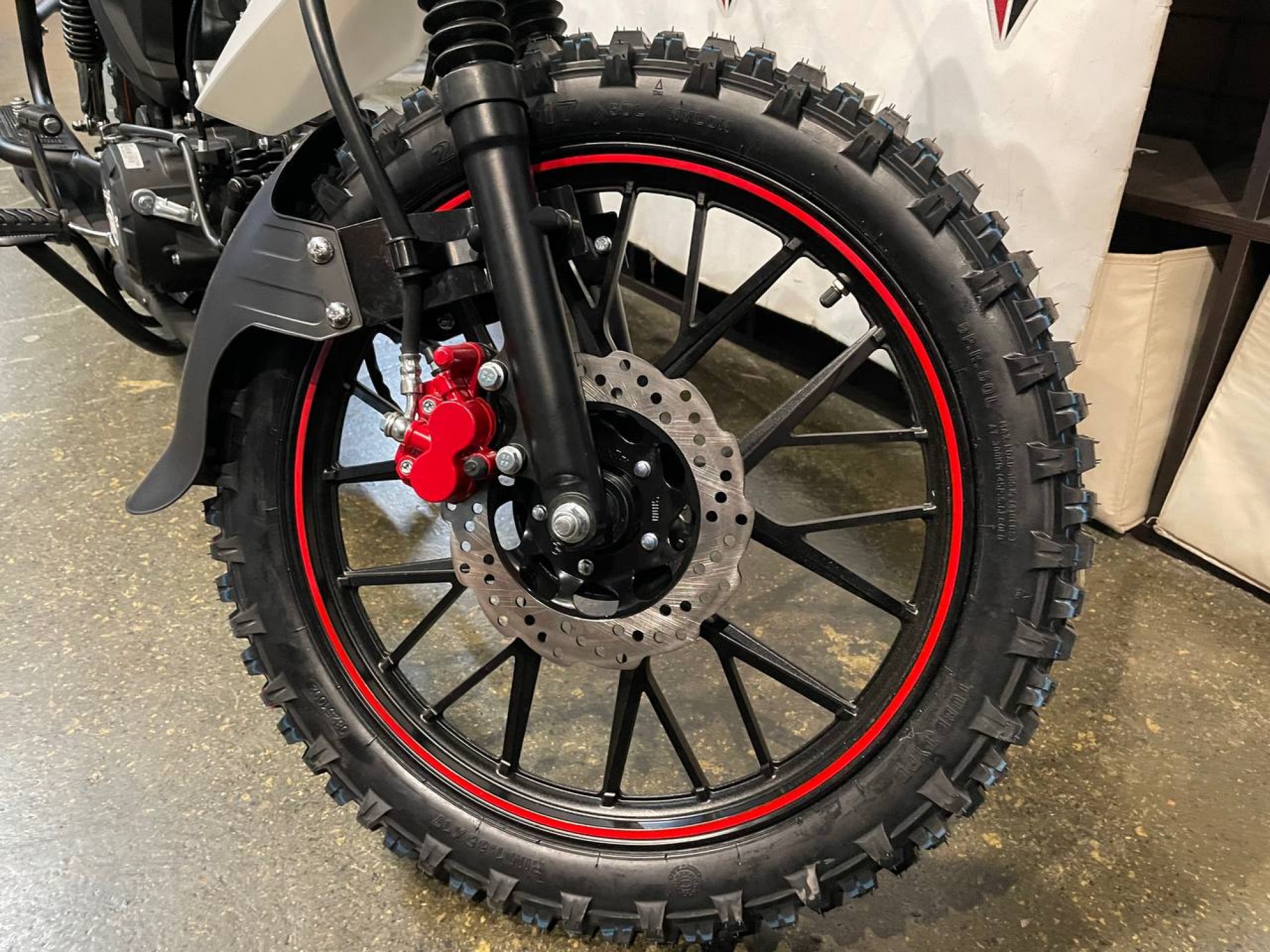 2. Заводская упаковка (в коробке): мотоцикл частично разобран (снято переднее колесо и руль) и зафиксирован в жестком металлическом каркасе. В этом состоянии техника надежно защищена от повреждений и готова к транспортировке. Сверху на металлический каркас надет картонный короб без дна.